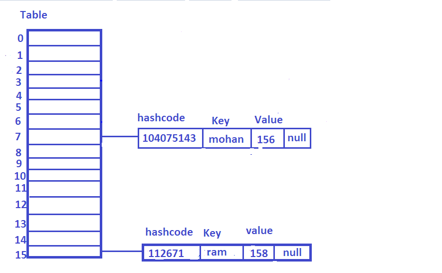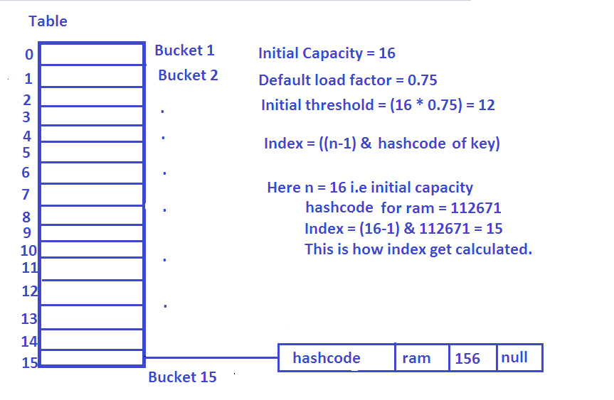 index = (n-1) & hashcode. Here n = initial capacity i.e 16. In our case since the key is ram, the hashcode of ram is 112671 using hash() method. If we do System.out.println((16-1) & 112671), the output will be 15 and yes at 15th index first pair will get stored. We will see later how the index will be calculated in detail.