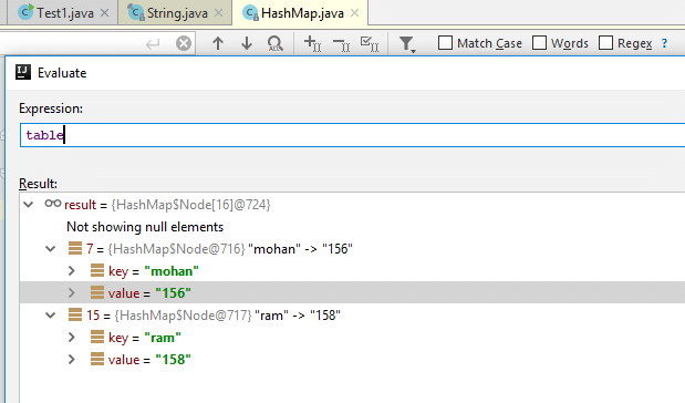 Now have a look at highlighted line i.e 6. What’s going on. This is the code(i = (n – 1) & hash]) which decides index, where our first element i.e (“ram”, 156) is going to stay. Let’s do one thing, just write a simple program and run separately in eclipse and observe the output.