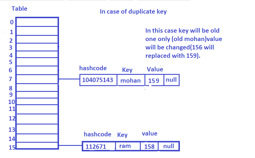 - If the key will be duplicate, it will not create a new node, the only old value will be replaced with the new value. The equals() method will use here.