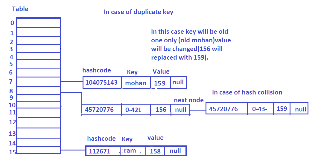 In the above diagram at the 8th index, we have two nodes. Same way if we have some key which has hashcode 45720776 is going to stay 8th index but that must be different(it should not duplicate). This is all about what happens in case of a hash collision.