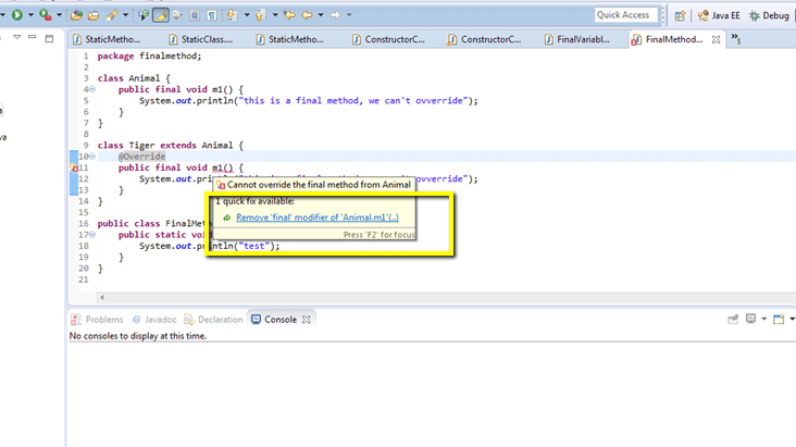 We can’t override final method, it will give compilation error.