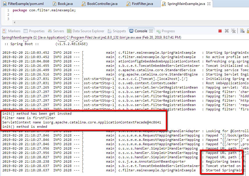 2019-02-21 09:35:11.984 INFO 4044 — [ost-startStop-1] o.s.b.w.servlet.FilterRegistrationBean : Mapping filter: ‘secondFilter’ to: [/*]