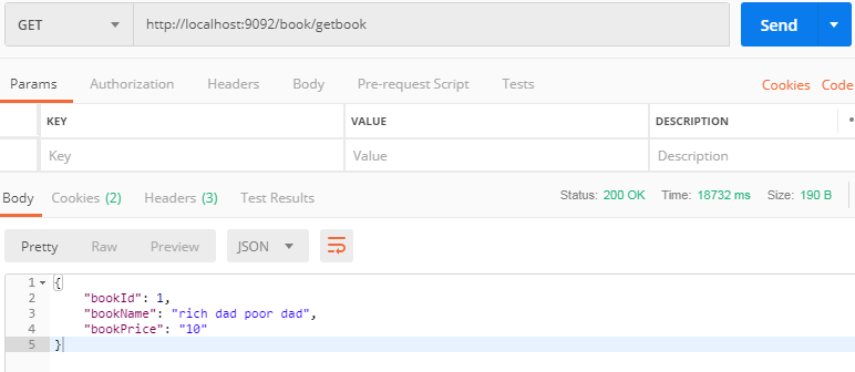 @RestController @RequestMapping("/book") public class BookController { @RequestMapping(value = "/getbook",method = RequestMethod.GET) @ResponseBody public Book getBook() { Book book = new Book(); book.setBookId(1); book.setBookName("rich dad poor dad"); book.setBookPrice("10"); return book; } }