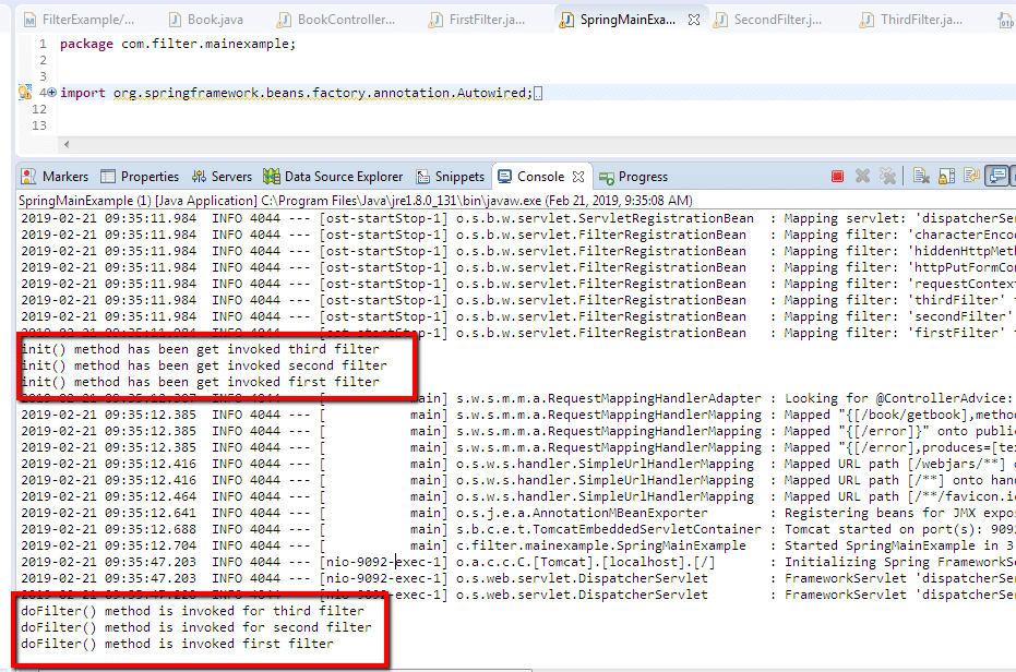 Let’s run the SpringMainExample.java, In the console, we can see the third filter has been called first, the second filter has been called second and third filter has been called the third time.