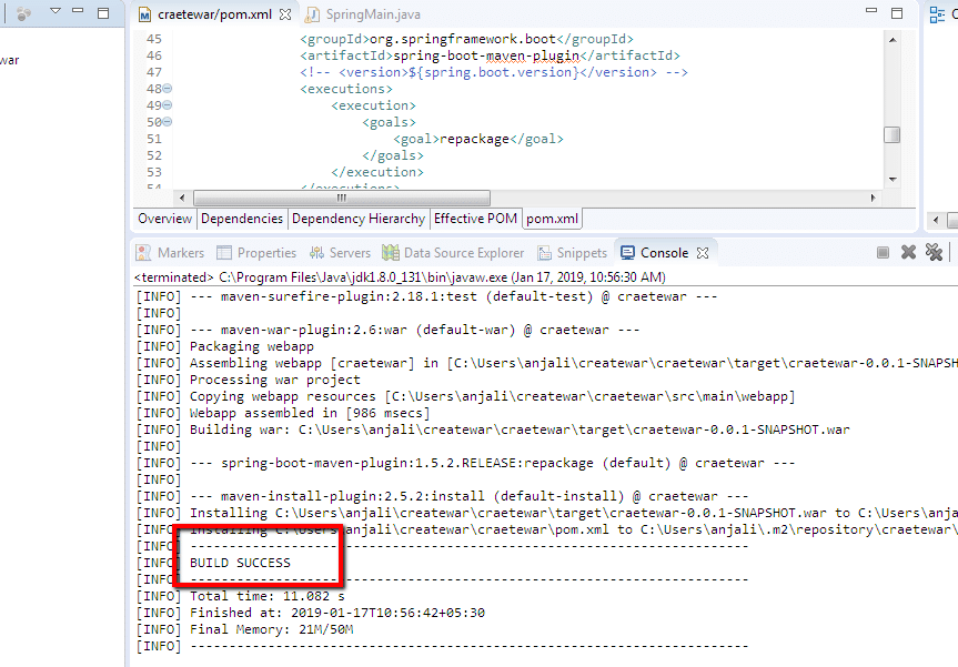 Again run as maven install. The build will be successful and have war file in the target folder.