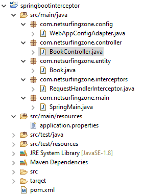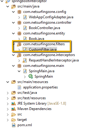 We will define a Filter called CustomFilter.java and we have already an interceptor i.e RequestHandlerInterceptor.java. Let’s see the directory structure of Filter.