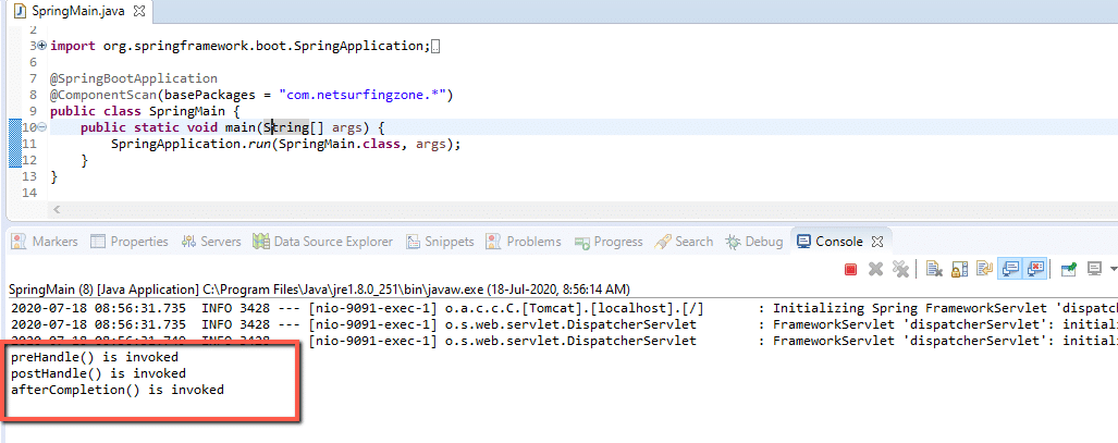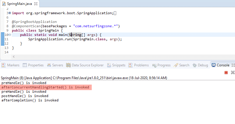 AsyncHandlerInterceptor – This interceptor extends HandlerInterceptor and contains afterConcurrentHandlingStarted() callback method. We have already seen when this method will get invoked.