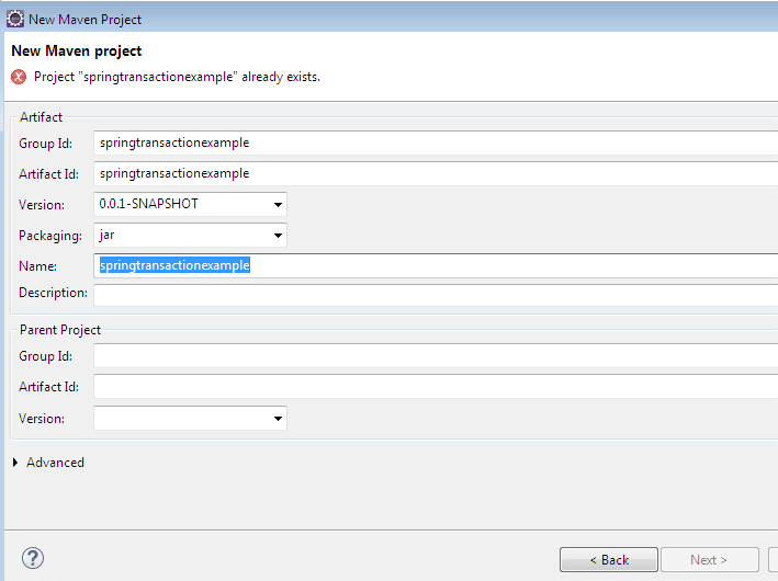 <project xmlns="http://maven.apache.org/POM/4.0.0" xmlns:xsi="http://www.w3.org/2001/XMLSchema-instance" xsi:schemaLocation="http://maven.apache.org/POM/4.0.0 http://maven.apache.org/xsd/maven-4.0.0.xsd"> <modelVersion>4.0.0</modelVersion> <groupId>springtransactionexample</groupId> <artifactId>springtransactionexample</artifactId> <version>0.0.1-SNAPSHOT</version> <name>springtransactionexample</name> <parent> <groupId>org.springframework.boot</groupId> <artifactId>spring-boot-starter-parent</artifactId> <version>1.5.2.RELEASE</version> </parent> <dependencies> <dependency> <groupId>org.springframework.boot</groupId> <artifactId>spring-boot-starter-web</artifactId> </dependency> <dependency> <groupId>org.springframework.boot</groupId> <artifactId>spring-boot-starter-data-jpa</artifactId> </dependency> </dependencies> </project>